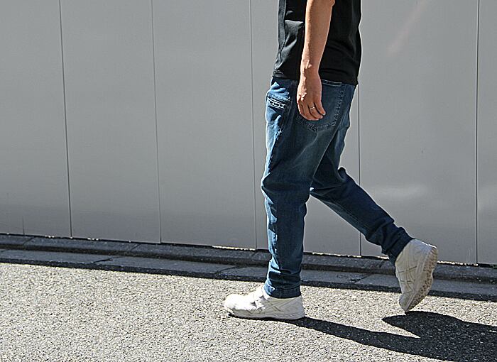 ひざ下は細身のパンツですが、ストレッチ性のある素材を使用しているので、適度なゆとりと動きやすさに配慮した設計になっています。ヴィンテージ加工のデニムを使用しているので、使い込まれたような味が特長です。