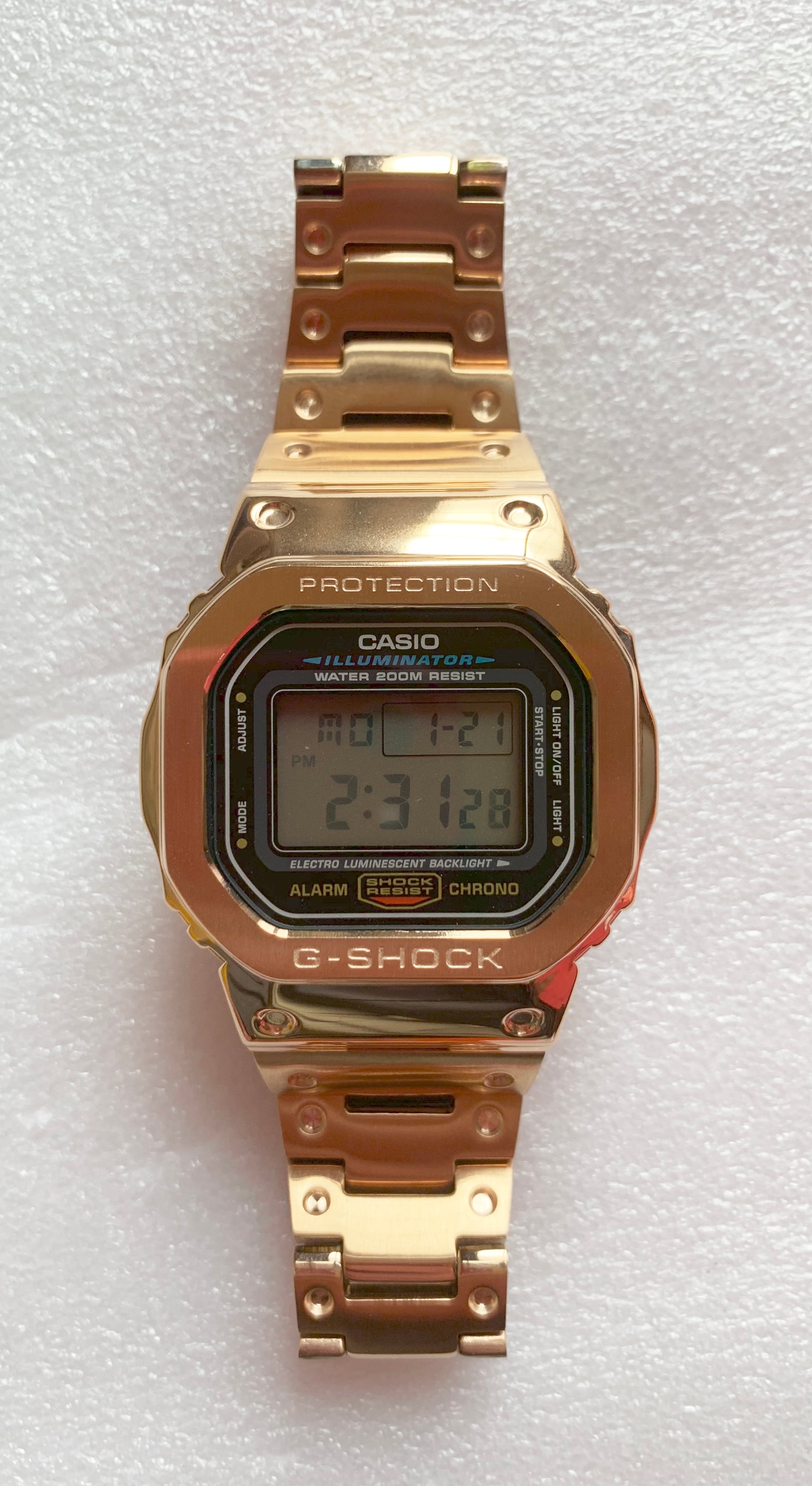 新品のDW-5600-1に、同じく新品のピンクゴールドのメタルのベゼルとバンドを付け替えています。